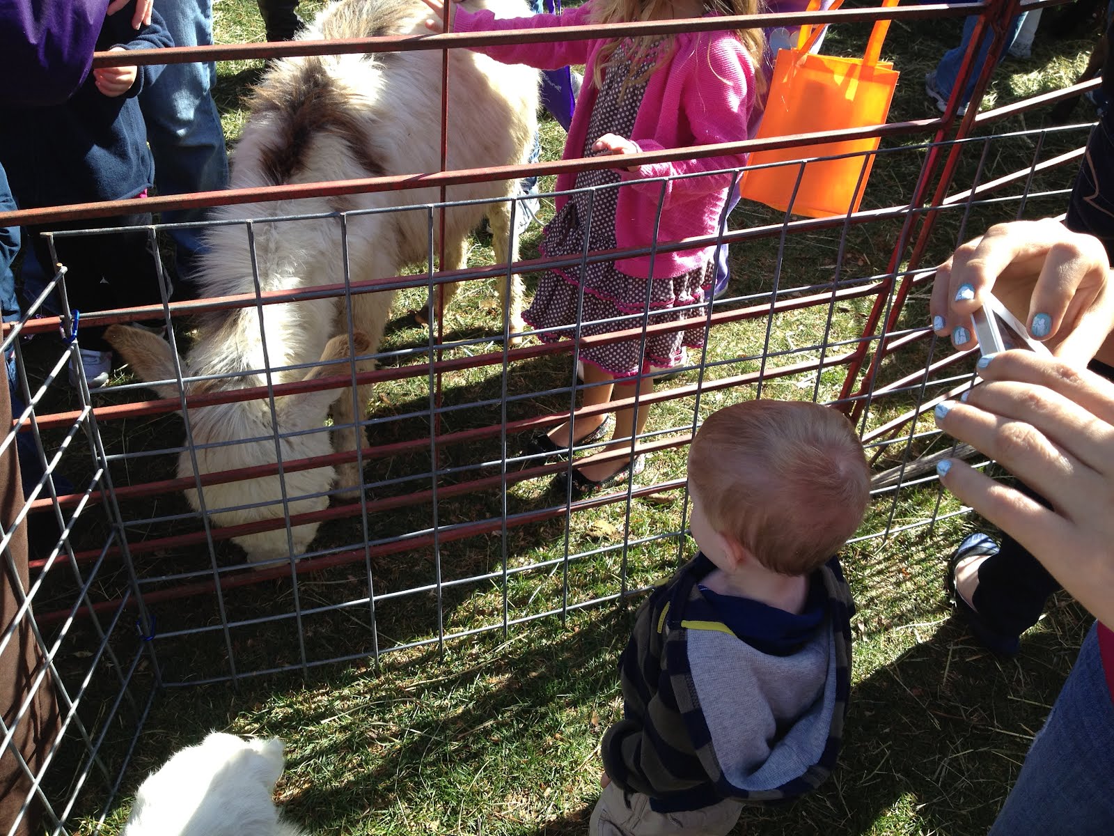 We had many fun activities going on for Easter. We weren't able to go to our church Easter egg hunt because Braxton was sick; however, this weekend we were feeling better and got to go to TWO egg hunt's. The first was a community fest. We got to see baby goats, baby sheep, a "teenager" cow, a donkey, a real life white rabbit, and some ducklings. We also got to color a picture and Braxton got to pick up five eggs. Within those five eggs were candy and three coupons for karate...needless to say we aren't really into karate so we won't be using them. I thought it was funny that when the egg hunt went into action they played the song "I want candy." How very appropriate! The second egg hunt was a little more exciting. Patrick was working the egg hunt at Lavell Edwards Stadium and so we went along. There was candy, candy, and did I mention candy?!! Cosmo and the Easter Bunny were both there to add to the fun. Braxton picked up enough candy (and a foam finger) on the sidelines that we didn't even have to let him loose on the field. Braxton didn't take long to figure out how to open the eggs to get the candy inside them; I turned around once to find him opening yet another egg and SHOVING all of the jelly beans that were in the egg into his little mouth before I could say no. We had a blast but sorely missed nap time later in the day!